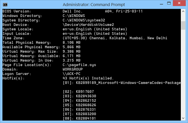 This will display detailed configuration data about a computer and its operating organisation, including operating organization configuration, security information, product ID, and hardware backdrop, such as RAM, disk space, and network card, including System Kicking Time, Bios version, Processor details, Memory details, Page file information, Hotfixes installed, etc.